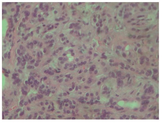 Successfully diagnosing oral polymorphous adenocarcinoma requires specific immunohistochemical markers. One such marker, p63, is frequently positive, and studies have indicated a 100% positivity rate; however, p63 also shows frequent positivity in both adenoid cystic carcinomas and pleomorphic adenomas [3]. p40 immunostaining emerges as a crucial tool, as it is effective in distinguishing polymorphous adenocarcinoma from adenoid cystic carcinomas and pleomorphic adenomas, with all polymorphous adenocarcinoma cases in the study showing negative results for p40 (as in our case) [3]. Furthermore, uniformly positive vimentin and cytokeratin 7 (as in our case) staining can also suffice for a final diagnosis, albeit these markers may not be informative in cases involving rare two-layer ducts [4]. Estrogen receptors are also expected to be negative in pleomorphic adenomas, Warthin’s tumors, mucoepidermoid carcinomas and adenoid cystic carcinomas [5,6]. The expression of hormone receptors in salivary malignancies may vary [7], and one study also shows negative results regarding the presence of estrogen receptors in polymorphous adenocarcinoma [8]. This may be interpreted as follows: estrogen receptors do not belong to the strict immunophenotype of polymorphous adenocarcinoma; however, when positive, screening and imaging of the breast should take place. In our case, the mother of our patient had a medical history of breast cancer, and due to this association between breast cancer and salivary gland cancer [8], the patient was advised to consult a gynecologist. A detailed examination of histological features enables the accurate identification of tumor type, stage, and grade. Diagnosing oral polymorphous adenocarcinoma, especially from adenoid cystic carcinoma, is important, as the management strategies for these tumors differ significantly [9]. Adenoid cystic carcinoma often requires more aggressive treatment approaches like radical neck dissection and adjuvant radiotherapy, which are not typically necessary for oral polymorphous adenocarcinoma [9]. In the case of limited biopsy material, due to the localization in cases such as ours, the oral and maxillofacial pathologists may struggle to obtain sufficient tissue to make a definitive diagnosis [9]. Furthermore, the tissue specimen should be taken from the center of the lesion to depict accurately the histological characteristics of the palatal tumors such as salivary gland neoplasms and lymphomas. Surgical excision with clear margins remains the cornerstone of management of the disease, aiming to reduce the risk of local recurrence, rarely even decades post-diagnosis, or the risk of uncontrolled metastases, which may take place much later than initially expected [10,11]. The guidelines recommend follow-up lasting 10 years or more for effective management of the disease [12]. Radiation therapy may be considered as an adjunct to surgery, particularly if surgical margins are positive or if the tumor localization does not allow for its complete surgical resection [13]. This approach depends also on the tumor’s histopathological complexity, since it may complicate diagnosis, and necessitate aggressive initial treatment [14]. Factors such as tumor size, depth of invasion, and extent of lymph node involvement significantly influence the surgical approach [15]. A recent retrospective study of minor salivary gland tumors reported polymorphous adenocarcinoma as the most common entity (12/30 patients). Most of the patients manifested well-differentiated tumors. A total of 29/30 patients were treated through surgery, 11/30 received adjuvant radiotherapy, and 6/30 received chemotherapy. The relatively high recurrence rate of 26.66% was registered [16]. In our case, the prompt biopsy and definitive surgical treatment elevates the possibility of avoiding any recurrence, and ensuring that the patient will enjoy a disease-free future. This case further illustrates the importance of immunohistochemistry and the need to biopsy even benign-appearing lesions.