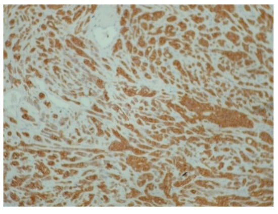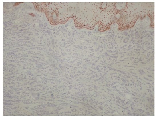 The palpation revealed that the tumor originated from the left half of the soft palate, close to the transition from the soft palate to the hard palate, most probably from the minor salivary glands which are typically localized there. The tumor had a wide base, with a diameter of 2.5 cm, and appeared benign, with regard to its color, texture, and lack of ulceration. Apart from the feeling of having a protuberance in the oral cavity, the patient did not report any other symptoms. However, due to the possible involvement of minor salivary glands and their related pathology, an incisional biopsy was carried out. Biopsy is the golden standard because the alternative, fine needle aspiration, is more likely to lead to misdiagnosis due to insufficient sample volume. The initial differential diagnosis included polymorphous adenocarcinoma, adenoid cystic carcinoma, mucoepidermoid carcinoma and pleiomorphic adenoma. The histopathological examination employed immunohistochemistry to provide a definite diagnosis (Figure 2, Figure 3, Figure 4, Figure 5, Figure 6, Figure 7 and Figure 8).