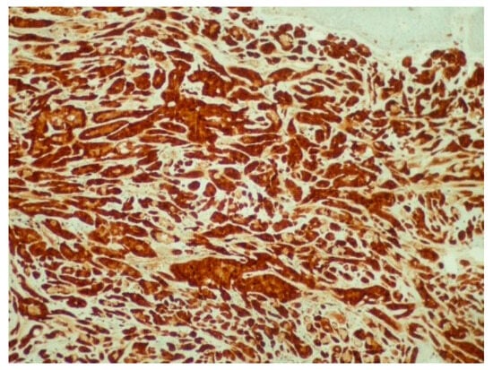 Diffuse and intense positivity of neoplastic cells for cytokeratin 7 (immunoperoxidase ×100).