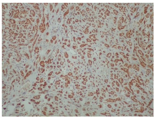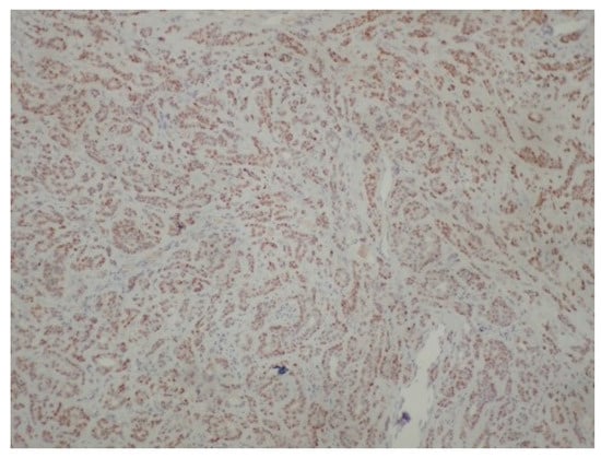 Positivity of neoplastic cells for estrogenic receptors (ER) (immunoperoxidase ×100).