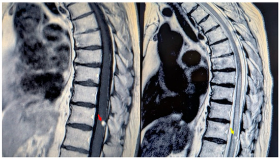 MRI of the thoracic spine. Left: T1-weighted image showing the expansive lesion at the T11 level (red arrow). Right: T2-weighted image revealing the lesion with surrounding edema (yellow arrow).