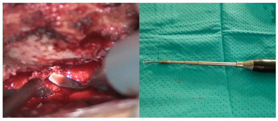 Piezoelectric osteotome while performing laminoplasty (left) and intra-operative view of a long tip used to reach deep surgical fields.