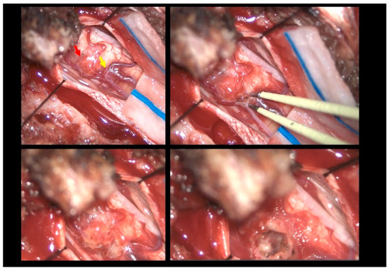 Intraoperative findings. Upper left: Visualization of the hemangioma (red arrow) associated with the vascular malformation resembling a dural arteriovenous fistula (yellow arrow). Upper right: Sealing of the fistula using bipolar cautery. Bottom left: Macroscopic color change following fistula closure. Bottom right: Macroscopic appearance following hemangioma removal.