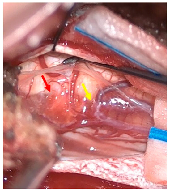 Intraoperative findings. The hemangioma (red arrow) and arteriovenous fistula (yellow arrow).