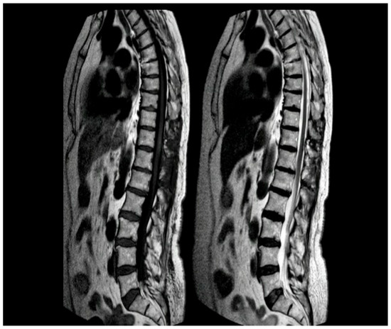 Post-operative MRI of the thoracic spine at 3 months. Left: T1-weighted image showing the absence of hyperintense findings. Right: T2-weighted image showing edema resolution.