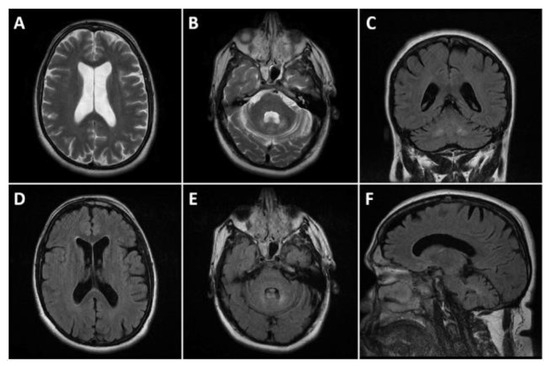 Figure 2. Head MRI presenting cortical atrophy and bilateral changes in the signal intensity in the zones of the dentate nucleus. (A,B): T2 axials; (D,E): FLAIR axials; (C): FLAIR coronal, and (F): FLAIR sagittal. Dilated ventricular system and subarachnoid fluid spaces on the convexity bilaterally (A,D). Symmetric T2 and FLAIR hyperintensities affecting the dentate nuclei (B,C,E,F).