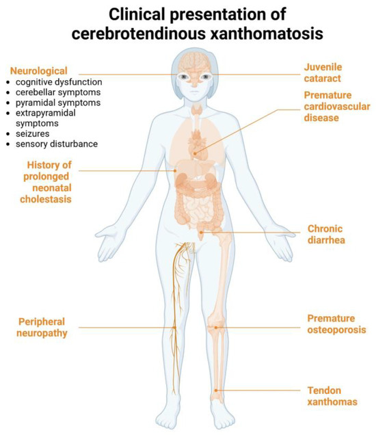 The primary site of cholestanol accumulation is the central nervous system, leading to significant neurological manifestations. However, CTX also causes a range of non-neurological symptoms, affecting multiple organs and systems. Clinical presentations of CTX often include intellectual disability, progressive neurological decline, cataracts, tendon xanthomas, and an elevated risk of cardiovascular disease, among other symptoms [3]. Given this diverse and sometimes ambiguous clinical picture, CTX is frequently misdiagnosed or undiagnosed for years, especially in general clinical practice, where rare diseases may not be considered as part of differential diagnoses [4,5].