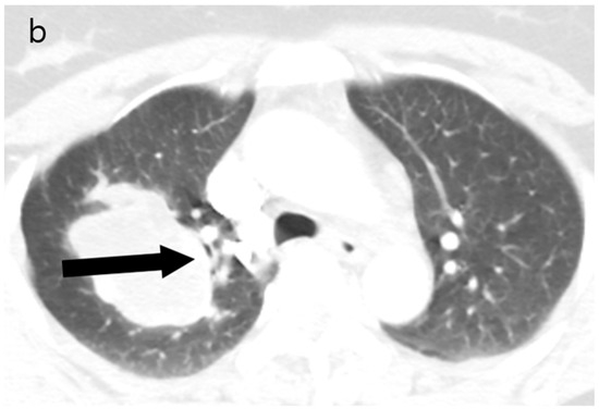 Figure 2. (a) Unenhanced chest CT showed a homogeneous hypodense mass (5.6 cm in diameter) in the right upper lobe (white arrow). The mass had a well-defined shape with a primarily smooth, but partially beak-like lobulated margin. (b) There was splaying of the anterior and posterior segmental bronchi (black arrow) from the mass effect.