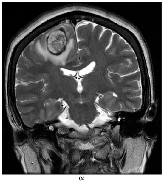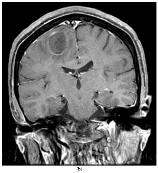 Figure 6. Three-months postoperative coronal (a) T2 and (b) enhanced T1 images revealed a hemorrhagic rim-enhancing mass with perilesional edema in the right frontal lobe.