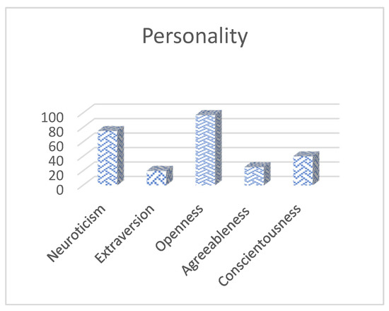 Percentile scores obtained by the patient in the five domains of the NEO-FFI personality questionnaire: neuroticism, extraversion, openness to experience, agreeableness, and conscientiousness. Percentiles are based on normative Spanish population data. Higher percentiles reflect the greater presence of each trait.