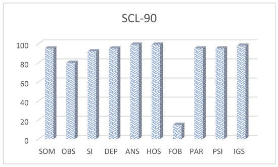 Percentile scores obtained by the patient in the nine dimensions of the SCL-90-R: somatization, obsessive–compulsive, interpersonal sensitivity, depression, anxiety, hostility, phobic anxiety, paranoid ideation, and psychoticism, plus the Global Severity Index (GSI). Scores above the 80th percentile indicate very high levels of psychological symptomatology.