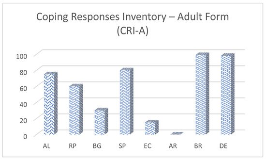 In the Coping Responses Inventory–Adult Form (CRI-A), the patient presented a very high level of alternative reward-seeking and emotional discharge, a high level of logical analysis and problem-solving, an average level of positive reappraisal, a very low level of acceptance and resignation, and low levels of guidance-seeking and cognitive avoidance (Figure 3).