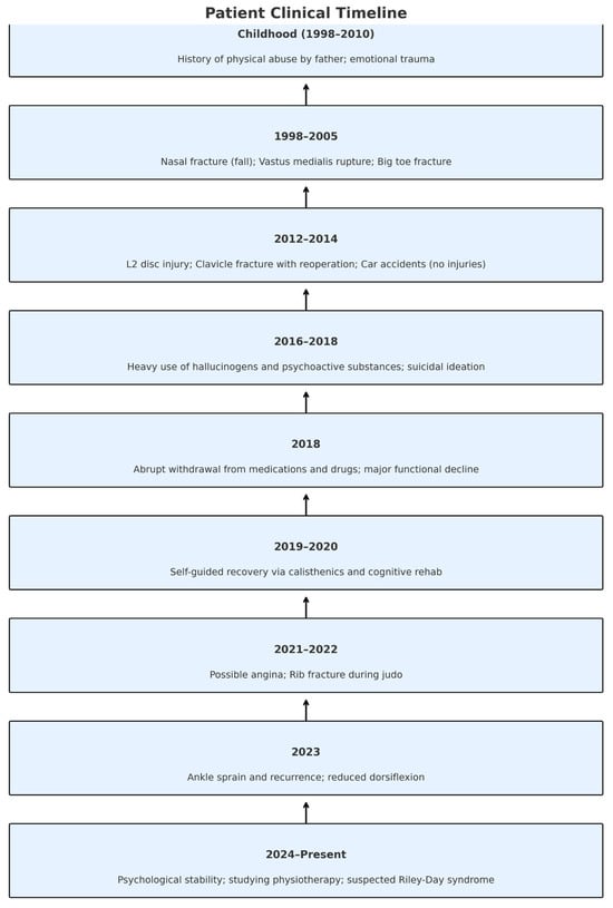 Chronological clinical timeline of the patient, summarizing major life events from childhood to present. Key milestones include episodes of trauma, onset of substance use, psychiatric decline, and gradual functional recovery through self-directed rehabilitation. This visual representation contextualizes the relationship between early adversity, altered pain perception, and the emergence of complex psychopathology, providing a temporal framework to interpret the current clinical profile.