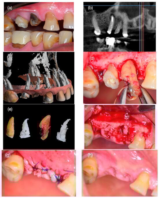 Condition of teeth #15 and #14 with vertical fracture (a) and presence of the root condition with osteolytic lesion in the apex of tooth #15 with poor prognosis for rehabilitation (b). With the CBCT exam, the three-dimensional reconstruction of the roots (c) and the creation of the scaffolds simulated the shape of the roots (e). In the tooth extraction (d), the scaffolds were installed in each socket (f), and the wound with a simple suture without flap tension was closed (g). After 28 days, the wound was closed without signs of infection, inflammation, or dehiscence (h).