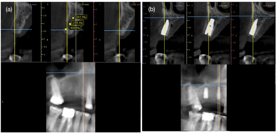 Radiographic control with CBCT six months after scaffold installation (a) and four months after dental implant installation (b). The colored lines on the radiographic image represent the tomographic slice every one millimeter. Radiological signs of medullary bone with Hounsfield unit (Hu) in the scaffold area (Hu: 321.5 ± 98.3) similar to medullary bone distally to tooth #13 (Hu: 369.5 ± 85.7) and mesially to tooth #16 (Hu: 371.9 ± 72.3). The dental implant shows signs of osseointegration and new bone formation covering the implant platform.