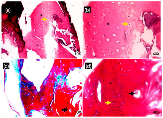 Histology with hematoxylin-eosin (a,b) and Masson Tricomic stain (c,d) from biopsy of tooth #14 area. Bone tissue was observed with the presence of lamellar structure (black asterisk) with the appearance of Haversian canals (black arrow), longitudinal and concentric lamellae, and osteocyte spaces (yellow arrow).