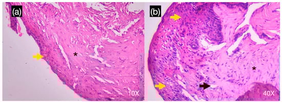 A histological sample with hematoxylin-eosin in 10× (a) and 40 × (b) of the tissue extracted from the scaffold of tooth #15 showed lax connective tissue with mixed inflammatory infiltrate of lymphoplasmacytic predominance (black asterisk), the presence of small caliber blood vessels (black arrow), and partially lined by nonkeratinized pluristratified flat epithelium of hyperplastic appearance with atrophic areas (yellow arrow).