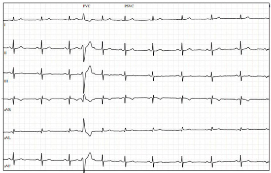 A 72-year-old physically active gentleman with hyperlipidemia (HLD) was referred to cardiology after presenting with upper respiratory infection symptoms, fatigue, and episodes of atrial fibrillation (AF) detected by his Apple Watch. His vitals were notable for a heart rate of 55 bpm, with physical examination being unremarkable. Initial electrocardiogram (ECG) revealed a few premature ventricular contractions (PVCs). The patient was provided with a Holter monitor, which revealed a 13% (13,104/day) PVC burden, and underwent a transthoracic echocardiogram (TTE), which demonstrated a normal EF and mild left atrial dilation. Stress echocardiogram was negative for exercise-induced ischemia but revealed multiple PVCs at rest (Figure 1).