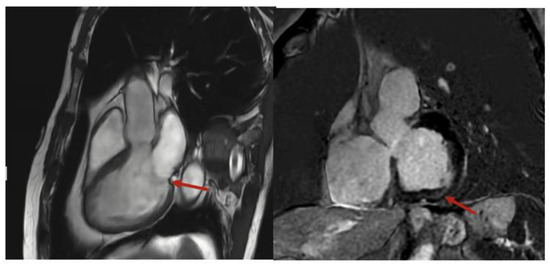 Interestingly, MAD may also be observed in normal hearts. A study utilizing CMR on a cohort of 98 subjects without valvular disease demonstrated the presence of MAD, defined as separation between the attachment of the mitral leaflet and the basal LV myocardium, in 96% of cases [8]. More importantly, the median height of disjunction was 3 mm in this normal cohort, compared to 5.2 to 10 mm in patients with MVP, and compared to 8 mm in patients with MVP and ventricular arrhythmias [9,10]. Taken together, these results suggest the height of MAD to be associated with arrhythmias. A 2020 analysis of 595 patients with MVP revealed that ventricular arrhythmias were associated with the male sex, severe mitral regurgitation (MR), the presence of more protracted displacement, and lower EF. Moreover, arrhythmia severity was positively correlated with mitral annular disjunction (MAD), mitral leaflet length and/or thickness, and left atrial and ventricular enlargement [10].
