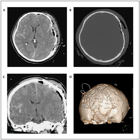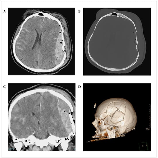 The patient was positioned supine. A Mayfield head-clamp was placed, and the head was slightly rotated to the right. The torn ear was temporarily refixed with single-button sutures. A trauma flap skin incision was made on the left side. Raney clips were placed, and the fracture and bone fragments were carefully exposed (Figure 3A). Some of the bone fragments were removed from the surgical wound using forceps. Subsequently, the temporal muscle was carefully elevated. Fractures extending up to the skull base were exposed (Figure 3B). A craniotomy was created around the fracture, first by making burr holes and then connecting them with the craniotome. The fracture was lifted in several bone fragments. An organized hematoma was identified underneath (Figure 3C) and was carefully removed with a dissector under continuous irrigation. Bleeding, especially from the area of the middle meningeal artery, was coagulated. Small tears in the area of the dura at the base were visualized. After complete evacuation of the hematoma, the dura was fully exposed. The dura was then opened in a crosswise fashion. A minimal subdural blood deposit was identified (Figure 3D) and was softly rinsed off. The brain appeared partially contused but showed slight pulsations. Repeated rinsing was performed. As no further space-occupying bleeding was present, the dura was closed with watertight sutures and sealed with TachoSil® (Corza Medical GmbH, Düsseldorf, Germany). The bone fragments were then reconstructed using small titanium plates and screws (MatrixNEURO™ Sterile Kit, DePuy Synthes GmbH, Oberdorf, Switzerland) and were repositioned en bloc to their original position (Figure 3E,F). Dura tenting sutures were placed and threaded through the fixed bone flap. A Redon drain was inserted epidurally. The wound was then closed in layers. The temporal muscle was sutured to the bone fragments using small bone plates. A subcutaneous suture was placed, followed by a penetrating skin suture. An ICP catheter was placed contralaterally for postoperative monitoring.