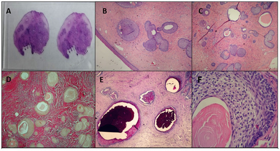 Figure 1. Pathological findings of the vaginal EOBT: (A) macroscopic view of the histological specimen H&E; (B) microscopic ×10 H&E; (C) microscopic ×10 H&E; (D) microscopic ×10 Van Gieson; (E) microscopic ×10 PAS—Alcyan blue; (F) microscopic ×100 H&E.