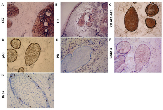 Figure 2. Immunohistochemical findings: (A) ×25 CK7; (B) ×ER; (C) ×25 CK AE1-AE3; (D) ×25 p63; (E) ×25 PR; (F) ×25 GATA 3; (G) ×25 Ki 67.