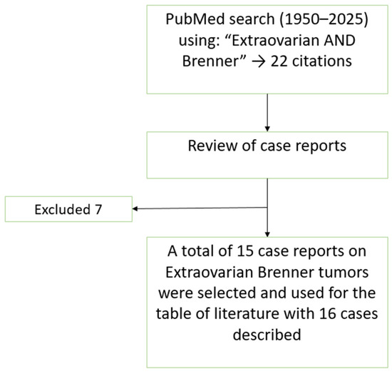 Extraovarian Brenner tumors (EOBTs) are exceptionally rare, with only a limited number of cases reported in the literature. To identify previously reported cases of EOBTs, we performed a literature search using PubMed and Google Scholar with the terms ‘extraovarian Brenner tumor’, ‘vaginal Brenner tumor’, and ‘extraovarian transitional cell tumor’. Reports in English from 1950 to 2024 were included. Sixteen cases met these criteria and are summarized in Table 1. A flowchart illustrating the literature search strategy and selection process is presented in Figure 3. The table consists of 16 cases of EOBTs in females, including the present case, focusing on patient demographics, tumor location and size, IHC, symptoms, treatment, and follow-up outcomes.