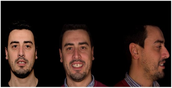 In addition to standard radiographs, a cone beam computed tomography (CBCT) scan was performed to obtain a three-dimensional assessment of the alveolar bone volume and morphology in the anterior maxillary region. Digital intraoral impressions were acquired using the Medit i500 scanner (MEDIT Corp., Seoul, Republic of Korea, Figure 2), complemented by intraoral and extraoral photographic records for comprehensive facial and dento-labial analysis (Figure 3 and Figure 4), as well as an aesthetic predictive simulation using digital smile design software (exocad’s DentalCAD 3.2 Elefsina, Smile Creator, exocad GmbH, Darmstadt, Germany).