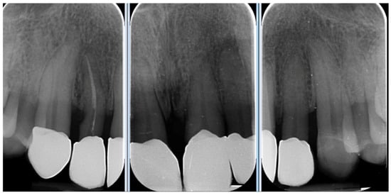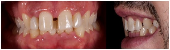 A 39-year-old male patient presented for prosthetic rehabilitation of the anterior maxillary region, primarily motivated by aesthetic concerns and periodontal health improvement. The patient reported a history of smoking (10–15 cigarettes per day since he was 18 years old) and had been diagnosed with localised stage III, grade B periodontitis. Even if the defect is mostly horizontal and localised to the II sextant, stage III was defined due to the bone loss extending to the middle third of the roots and the probing depth is ≥6 mm in this sextant. Moreover, smoking represents a risk factor able to classify the case as grade B. Initial clinical and radiographic evaluation (Figure 1) revealed the absence of all four third molars, the presence of conservative restorations on teeth 1.6, 3.7, and 4.6, and evidence of horizontal alveolar bone resorption in the regions corresponding to teeth 1.4 and 2.3. A conoid morphology was noted in the upper left lateral incisor.