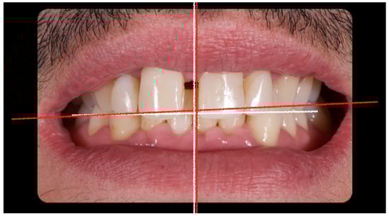 The initial aesthetic evaluation revealed a 7 mm incisal display at rest, a flat incisal edge morphology, a high smile line, and a smile width encompassing ten teeth with normal buccal corridors. The facial midline was aligned with the interincisal midline, although a diastema was observed between teeth 1.1 and 2.1 (Figure 5).