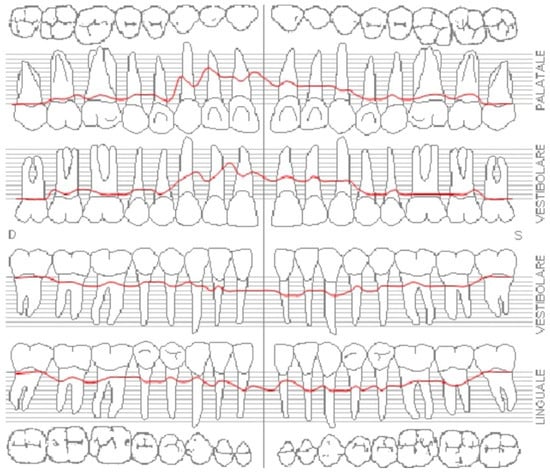 The occlusal plane appeared canted relative to both the labial commissure and the horizontal reference plane, whereas the interpupillary line was centred. Functional analysis demonstrated a minor discrepancy between the centric relation and maximum intercuspation (0.5 mm), a deep bite, and group function occlusion. An evaluation of maxillary positioning, mandibular dynamics, and temporomandibular joint (TMJ) function was conducted using the Zebris Jaw Movement Analysis System (JMA, zebris Medical GmbH, 88316 Isny, Germany). Periodontal assessment at baseline revealed stage III, grade B periodontitis with a mean probing depth of 2.6 mm, mean sextant probing depth of 4.8 mm, clinical attachment loss averaging 2.2 mm, a plaque index of 12%, bleeding on probing at 16%, and grade I mobility of teeth 1.1, 1.2, 2.1, and 2.2 (Figure 6).