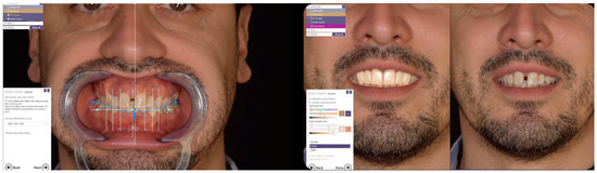 Initial periodontal therapy was performed to control inflammation and halt disease progression by removing supra- and subgingival plaque and calculus through professional cleaning (scaling and root planing), improving oral hygiene habits, and managing risk factors such as smoking and diabetes. A provisional restoration was then designed through a digital laboratory workflow (CAD—Smile Creator) (Figure 7) to simulate the final outcome and evaluate whether to maintain the interincisal diastema.
