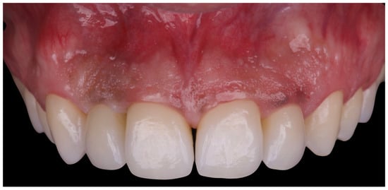 Following the completion of initial periodontal therapy, edgeless tooth preparations were performed on teeth 1.3, 1.2, 1.1, 2.1, and 2.2 using a Komet 6863D rotary instrument (Komet Italia SRL, Verona, Italy): “Teeth have been prepared according to principles of the biologically oriented preparation technique (BOPT), preserving and supporting the periodontium.” (Figure 9). The BOPT involves removing the anatomical cemento-enamel junction (CEJ) without creating a defined finish line. Intentional gingival sulcus instrumentation (“gingitage”) causes a controlled bleed and clot formation. This promotes the reattachment of the junctional epithelium and connective tissue at a new prosthetic margin level. A provisional crown is relined and contoured with a concave emergence profile. It stabilises the initial clot and directs tissue shape, thickness, and migration during healing—effectively re-sculpting soft tissue architecture at the margin. Margin placement within the sulcus is carefully limited (≤1 mm) to avoid invading the biologic width and causing inflammation. This controlled vertical placement preserves healthy connective tissue and junctional epithelium. Vertical preparation also allows the technician to adapt the emergence profile post-preparation. The final crown margin becomes a prosthetic CEJ (PCEJ), supporting optimal periodontal adaptation and preserving tissue integrity.