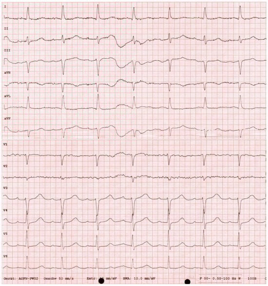 The No scientific information is lost, since all necessary waveform morphology and intervals can be assessed visually using the standard scaling (1 mm = 40 ms). For readers outside of cardiology, these values are of limited interpretative relevance. Therefore, I believe that the figure remains scientifically complete and appropriate as presented. ECG at admission showed no severe dysrhythmias nor signs of typical intoxications. I–III represent the standard limb leads; aVR, aVL, and aVF are augmented limb leads; V1–V6 are the precordial (chest) leads.
