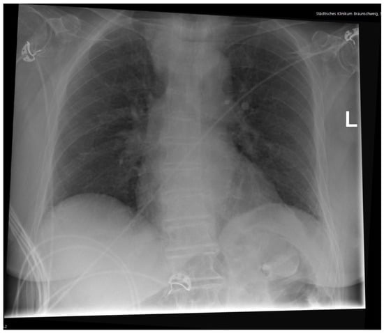 Chest X-ray showed no pneumonia or sign of heart failure. Pneumothorax or pleural effusions were not visible either. The upper mediastinum was slightly broadened due to a known goiter. The letter “L” denotes the patient’s left side and serves as a standard orientation marker in posteroanterior chest radiography.