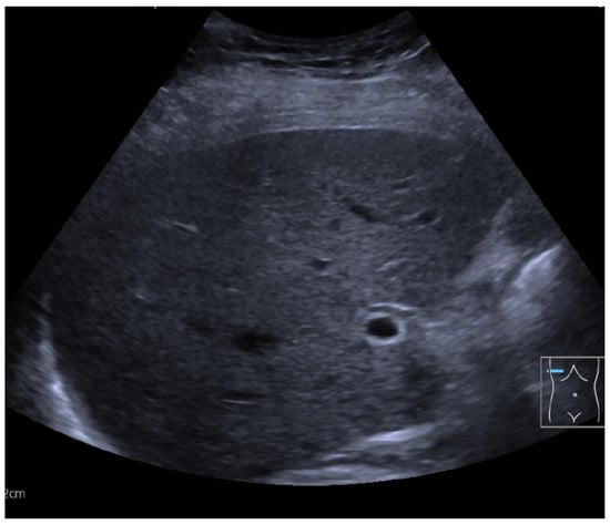 To exclude a non-convulsive epilepsy state, an EEG was performed In the EEG, Theta-Delta in the sense of sharp waves at alternating locations but no signs of epilepsy could be detected. However, according to the assessment of our neurology colleagues, the EEG suggested an encephalopathy, possibly of metabolic cause. Since all other common causes of coma already had been eliminated, blood alcohol and in particular Ammonia were measured, the latter being one of the leading causes of encephalopathy [,,,]. The blood test for Ethanol was negative but Ammonia was significantly increased to 346.9 umol/L (normal range 11–51 umol/L). Since the most common cause of hyperammonemia is (alcohol-derived) liver cirrhosis [,], an abdominal sonography was then performed but the liver showed no structural impairment (Figure 3). Moreover, transaminases were normal initially. Thus, hepatic encephalopathy HE as a cause could be nullified. Nevertheless, a therapy with 550 mg of Rifaximin twice a day was induced. Additionally, an aggressive laxative therapy with 10 mL of lactulose three times a day and multiple enemas per day was administered and vitals and Ammonia levels were monitored.