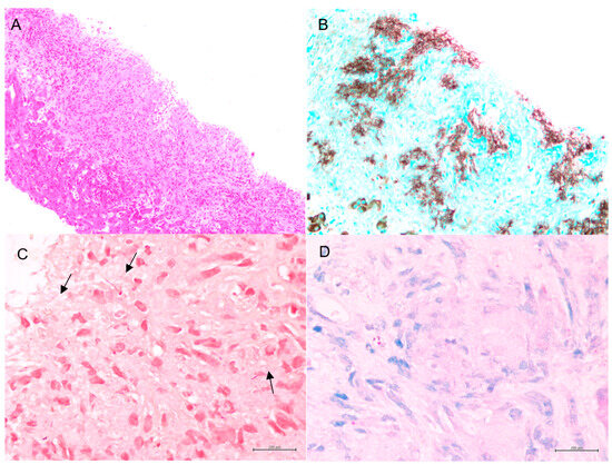 This case highlights the diagnostic challenges associated with disseminated nocardiosis, a rare and potentially life-threatening infection that can affect both immunocompetent and immunocompromised hosts, as well as the utility of histopathologic examination in addition to microbiological testing for patients with undifferentiated infectious diseases syndromes. The clinical manifestations of nocardiosis are highly heterogeneous and nonspecific, and the infection can affect various organs including the lungs, brain, and skin, resulting in a diverse presentation that can be difficult to differentiate from other infections [9]. Filamentous microorganisms such as Nocardia can resemble other pathogens, such as Candidatus savagella, complicating diagnosis due to their shared filamentous or branching morphology [6,10]. This finding is consistent with numerous previous studies, which highlight the diagnostic difficulties posed by the morphological similarities between Nocardia and other filamentous pathogens [4]. Actinomyces and Nocardia also share similarities in that both can cause acute inflammation or pyogranulomatous reactions, characterized by a combination of acute inflammation and granuloma formation [10,11]. This common pathological feature further complicates their differentiation. These findings also align with previous studies that emphasize the overlapping inflammatory responses in infections caused by Nocardia and Actinomyces, making it challenging to distinguish between the two [4]. Additionally, Nocardia, like many fungi or Actinomyces, is Gram-positive and may produce similar staining results, such as positive staining with Grocott–Gomori methenamine silver (GMS) [11]. This further complicates the diagnostic process, underscoring the importance of combining histopathological evaluation with microbiological culture and molecular testing. As such, recognizing morphology through special stains, along with a thorough differential diagnosis, is essential for accurate identification. Clinicians must also be aware of the limitations of these techniques, as false-negative results can occur, particularly when relying on a single diagnostic method and whenever possible, should endeavor to pair histopathological analysis with microbiologic investigations.