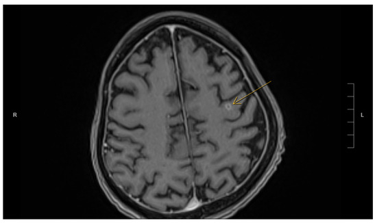 MRI of the brain demonstrating a 5 mm ring-enhancing lesion (indicated by arrow) in the left precentral gyrus.