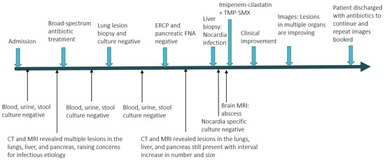 Fortunately, the histopathological examination of the targeted liver biopsy revealed necrotizing granulomas containing filamentous microorganisms. The histomorphology findings and special stain patterns raised the possibility of Nocardia infection; however, there was no reliable way to identify the specific species. The beaded morphology seen on special stains, along with the weak FITE stain signal, were consistent with features typically associated with Nocardia (see Figure 1). At the same time, Actinomyces was considered less likely due to the patient’s poor clinical response to initial antibiotic treatment with amoxicillin–clavulanate, vancomycin, and piperacillin–tazobactam, which were provided for cholangitis and possible pyogenic liver abscess. No organisms were detected on Ziehl–Neelsen staining, but the possibility of superimposed mycobacterial infection, such as TB, could not be entirely excluded due to the limited sensitivity of the Ziehl–Neelsen stain. As a result, the sample was sent for polymerase chain reaction (PCR) testing for tuberculosis, which was negative. Brain imaging was suggested to rule out a central nervous system (CNS) abscess, as CNS involvement is more common in immunocompromised patients with Nocardia infection [8]. This demonstrated a 5 mm rim-enhancing lesion in the left pre-frontal gyrus (see Figure 2). The patient was presumptively diagnosed with disseminated nocardiosis. He was initiated on antimicrobial therapy with a combination of imipenem–cilastatin and trimethoprim–sulfamethoxazole (TMP-SMX). He completed 3 months of combination therapy and thereafter was transitioned to monotherapy with TMP-SMX, which he took for an additional 5 months (total 8 months of therapy). This was discontinued at 8 months due to the development of drug-induced liver injury. While receiving this antimicrobial regimen, he demonstrated clinical improvement and radiological resolution of his brain, lung, liver, and pancreatic lesions, clinically confirming the diagnosis. He has been followed in the outpatient Infectious Diseases clinic, and one year after the discontinuation of his antimicrobials, there have been no clinical nor radiographic concerns for relapse. Figure 3 shows the timeline of the patient’s 3-month hospitalization with some selected important events.