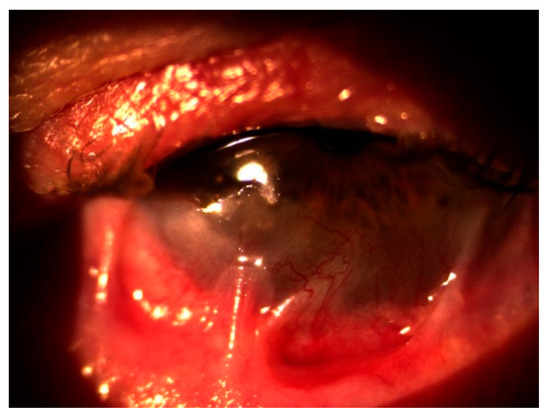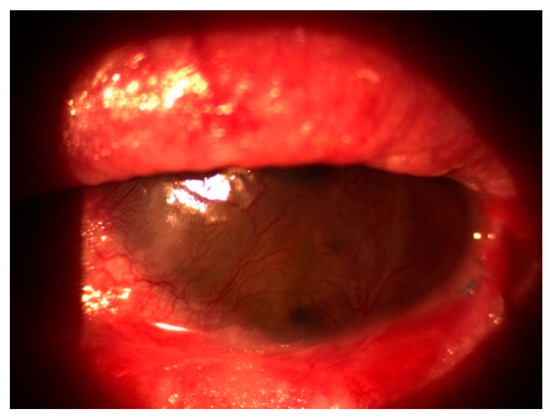 In October 2020, the patient returned with a best corrected visual acuity (BCVA) of hand movements (HM) in the left eye and newly developed involvement of the right eye, which had a BCVA of 0.8 decimal Snellen (logMAR 0.10) at that time. Slit-lamp examination showed severe inflammation accompanied by neovascularization, keratinization of the ocular surface, and ankyloblepharon in the left eye (Figure 1), as well as conjunctivitis with symblepharon formation in the right eye (Figure 2).
