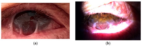 Ocular manifestations may present as chronic conjunctivitis, conjunctival defects, and subepithelial fibrosis, which can progress to conjunctival shrinkage and the development of symblepharon. Potential complications include entropion, trichiasis, corneal erosions, corneal neovascularization, dry eye disease, keratinization of the ocular surface, and secondary glaucoma, all of which can ultimately lead to vision loss or blindness [3,4,5].