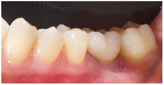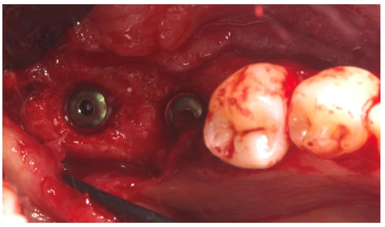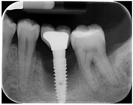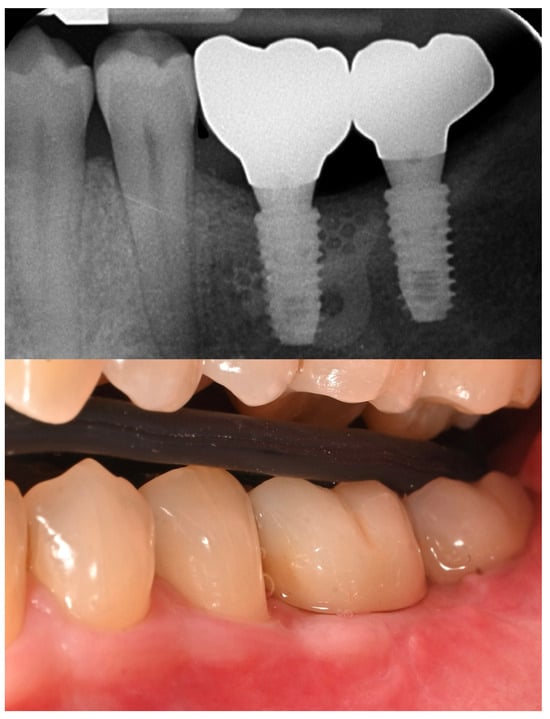 Treatment options—including retention or removal of the failing implant and molar—were discussed. Due to the patient’s age and extent of disease progression, the extraction of both the natural tooth and the implant was planned [,]. Written informed consent was obtained for all surgical and prosthetic procedures and the use of clinical and radiographic data for publication. The study adhered to the ethical principles of the 2013 Declaration of Helsinki.