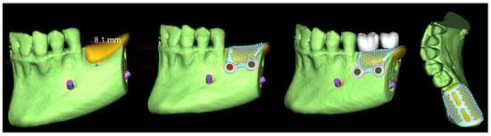The virtual implant planning was exported and a customized CAD/CAM titanium mesh was designed based on a commercially available template (OssBuilder, Osstem Implant Co. Ltd., Seoul, Republic of Korea) (Figure 3).