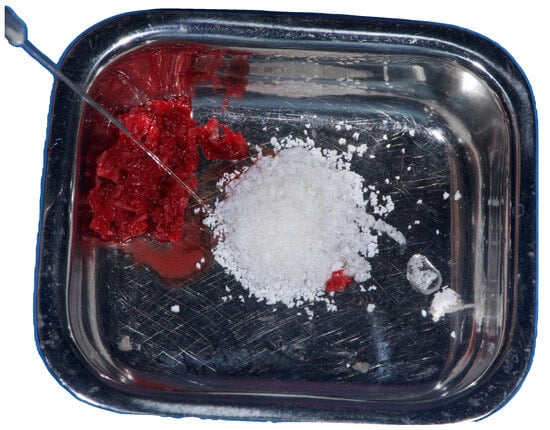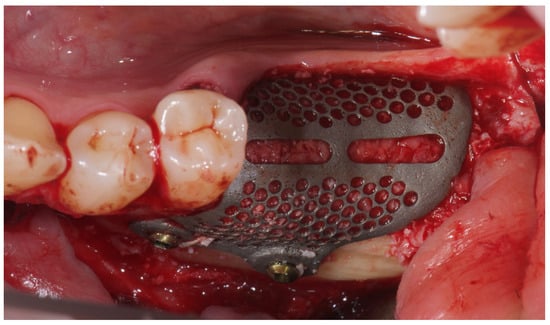 A buccally advanced crestal incision was made through the keratinized tissue (blade No. 15c), and a full-thickness flap was elevated. Vertical releasing incisions were placed mesially (two teeth away) and distally into the retromolar region. The site was debrided and autogenous bone was harvested using a cortical bone scraper (Safe Scraper, Micross, Meta, Reggio Emilia, Italy). After that, low-temperature plasma sterilization of the mesh was carried out. Subsequently, a 1:1 mixture (Figure 4) of autogenous bone and anorganic bovine bone, with a particle size ranging from 0.25 to 1 mm (1 g [2 boxes of 0.5 g [2 CC]]; A-Oss, Osstem Implant) was placed inside the titanium mesh and it was secured on the defect. The titanium mesh was fixed with two screws (Figure 5). Plasma treatment not only allows for high-level sterilization but also allows for a high level of decontamination, increasing the surface energy and the hydrophilicity of the titanium mesh [].