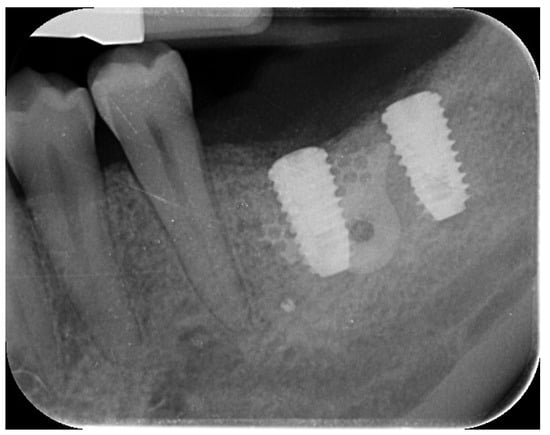 Nine months later, a periodical radiograph (Figure 6) and clinical examination confirmed adequate bone regeneration. Two implants (Osstem TSIII SOI, 4.5 mm in diameter and 10 mm in length; Osstem Implant Co., Ltd., Seoul, Republic of Korea) with hydrophilic surfaces were placed under local anesthesia, using a fully guided (Figure 7), metal-sleeve-free surgical template (OneGuide, Osstem Implant Co., Ltd., Seoul, Republic of Korea).