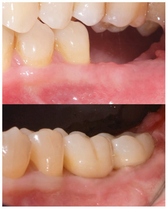 A free gingival graft (FGG), measuring 20 mm × 6 mm, was harvested from the palatal mucosa (first premolar to first molar). The epithelial layer of the FGG was partially removed to allow for partial subflap insertion, while a portion remained exposed. The graft was stabilized with resorbable single sutures. Two months post-grafting, a screw-retained temporary restoration was placed. Four months later, two single monolithic zirconia crowns, bonded to titanium link abutments, were delivered (Figure 10).