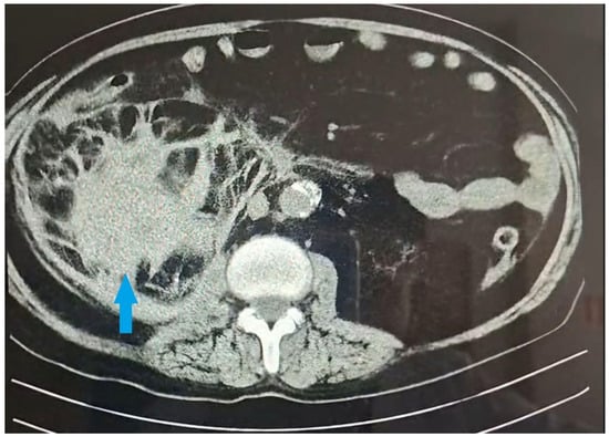 During a regular dialysis session, he complained of severe pain in his right lumbar region and hematuria. A detailed medical history revealed that the patient experienced mild right-sided lumbar tenderness 9–10 h prior to the current dialysis procedure while engaging in routine daily activities. He denied any preceding trauma. On physical examination, he presented afebrile, with pale, sweaty skin and arterial hypotension (BP 90/60 mmHg). A bedside abdominal ultrasound demonstrated subcapsular free fluid of the right kidney. Emergency contrast-enhanced computed tomography (CT) confirmed a massive subcapsular hematoma of the right kidney (size 10.8 × 8.6 cm) (Figure 1), infiltrating the retroperitoneal fat tissue. The patient was admitted to the urology clinic.
