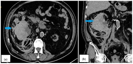 Contrast-enhanced CT scan on the second day ((a)—axial plane; (b)—coronal plane). The blue arrows indicate an increase in hematoma size to 12.37 × 6.23 cm and the presence of retroperitoneal blood collection.