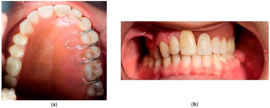 (a) Intraoral photograph of the upper occlusal arch. (b) Intraoral frontal photograph of appliance in situ.