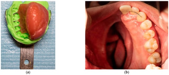 A follow-up evaluation every 3 months was recommended to monitor the condition of the prosthesis and surrounding structures. Given the heavy masticatory forces exerted in the upper jaw quadrant, periodic replacement of one or more clasps was often required. Six months later, in the latest recall appointment in April 2024, as such cases normally require, an impression was made using a tray, while the appliance was placed in situ, and the impression was promptly sent to the laboratory for fabrication (Figure 7a). Figure 7b shows the edentulous arch without the prosthesis during a follow-up appointment, illustrating the healed soft tissue contours and defect margins.